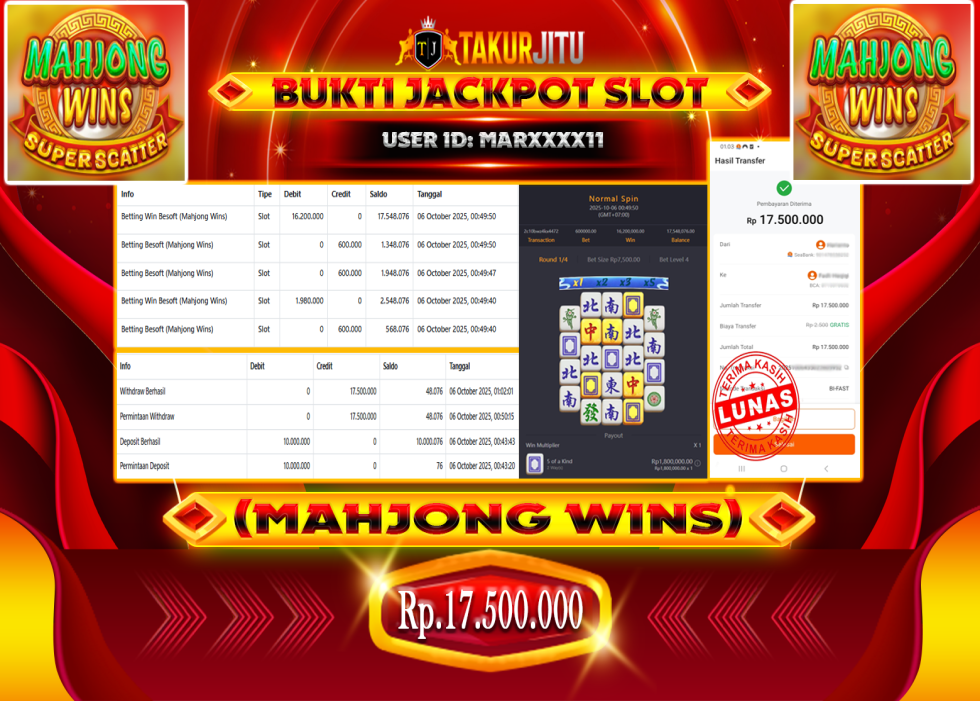 JACKPOT!!! DI MAHJONG WINS ( SLOT) SEBESAR Rp. 17,500,000